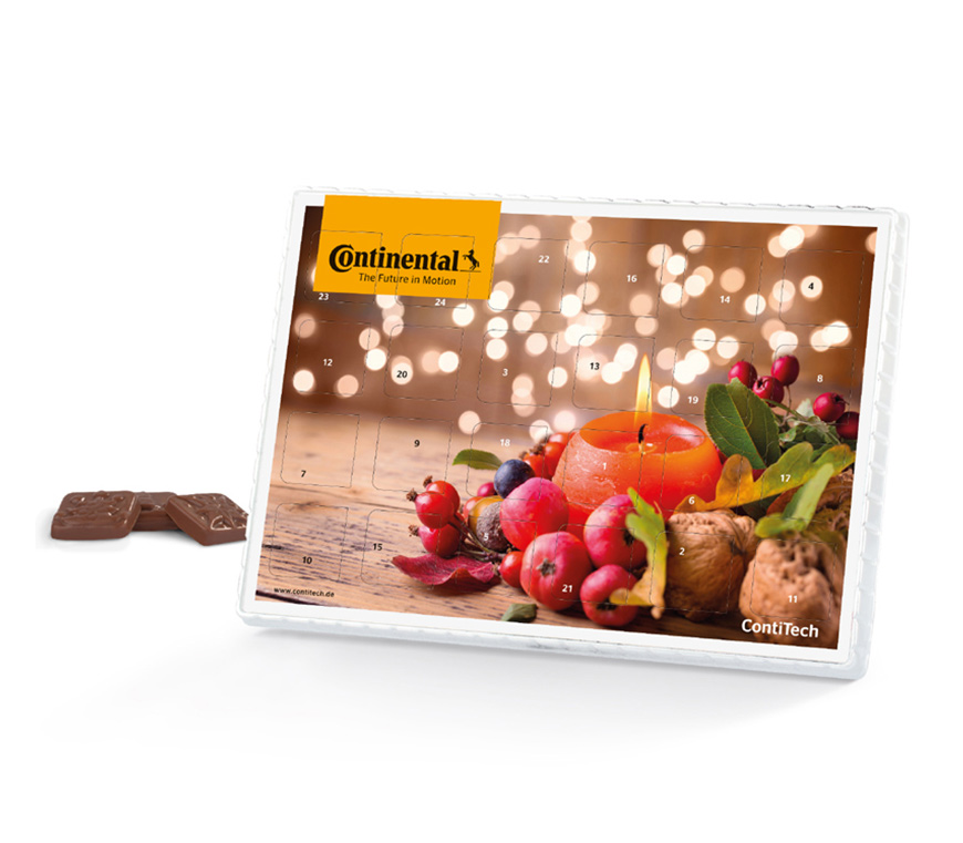 Adventskalender mit Schachtel in klassischen Weiß oder edlem Chromglanz mit aufgeklebtem Werbedeckblatt - individuell bedruckt.