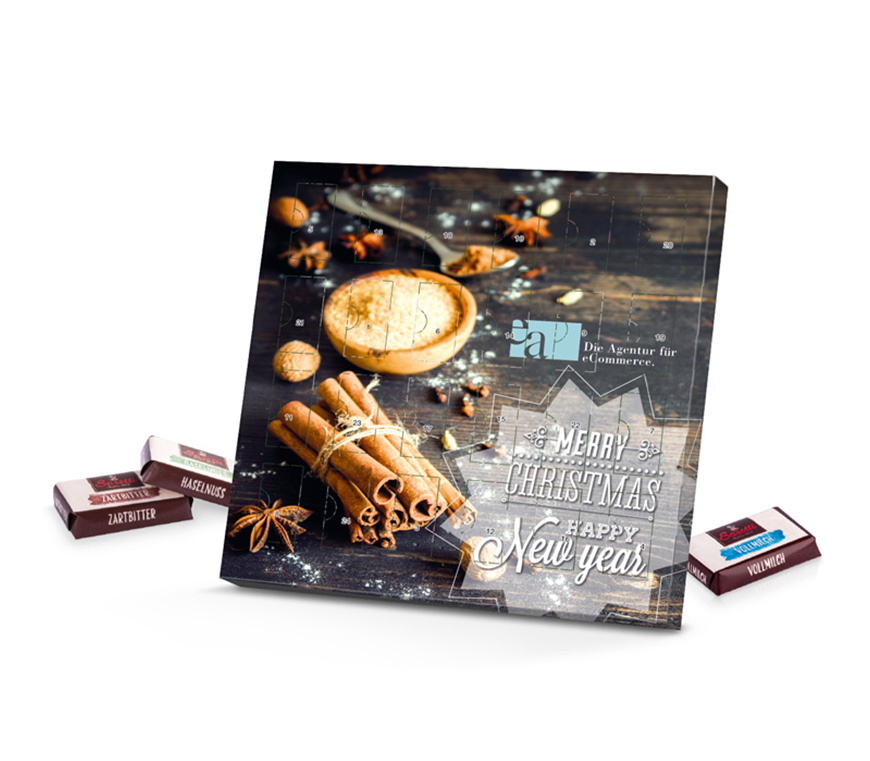 Schweizer Markenschokolade inside: Sarotti-Schokolade als Füllvariante des Täfelchen-Adventskalenders Sarotti, individuell bedruckt.