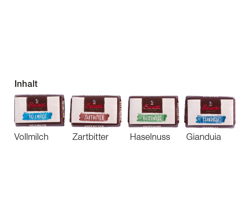 Inhalt: 24 Schokoladentäfelchen der Marke Sarotti in vier verschiedenen Sorten, bunt gemischt, 100 g