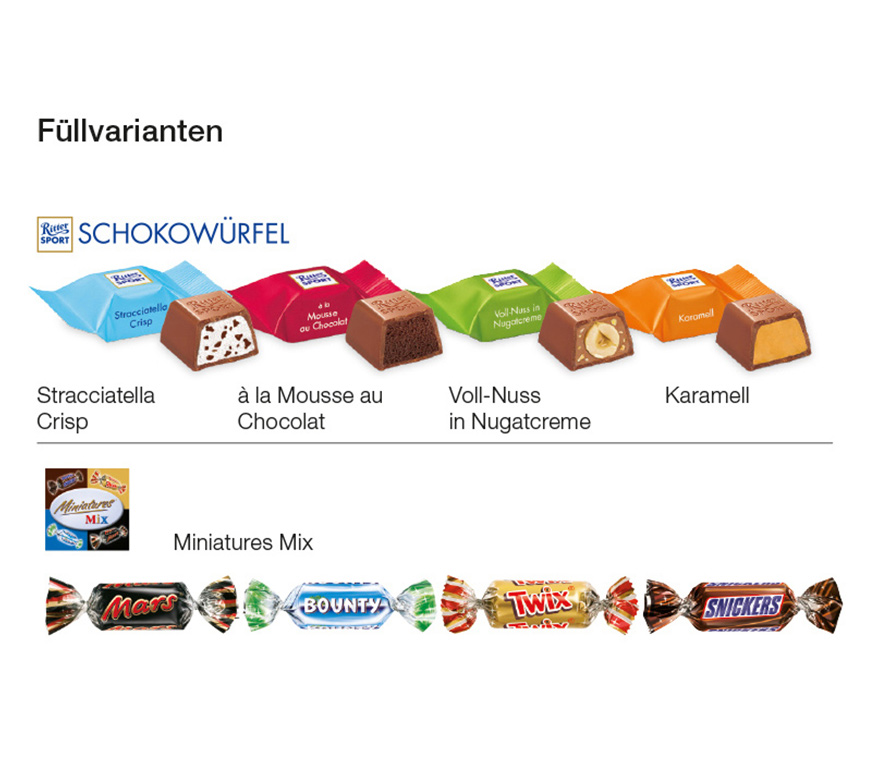Inhalt: 24 Schokowürfel der Marke Ritter SPORT, 192 g; Mini Schokoriegel Mars, Snickers, Bounty und Twix der Marke Mars, bunt gemischt, 240 g; Haselnussschnitte der Marke Ferrero gefüllt mit Kakaohaselnusscreme im Waffel Sandwich, 256 g oder Mini Schokoladentäfelchen der Marke Ritter SPORT, bunt gemischt, 396 g