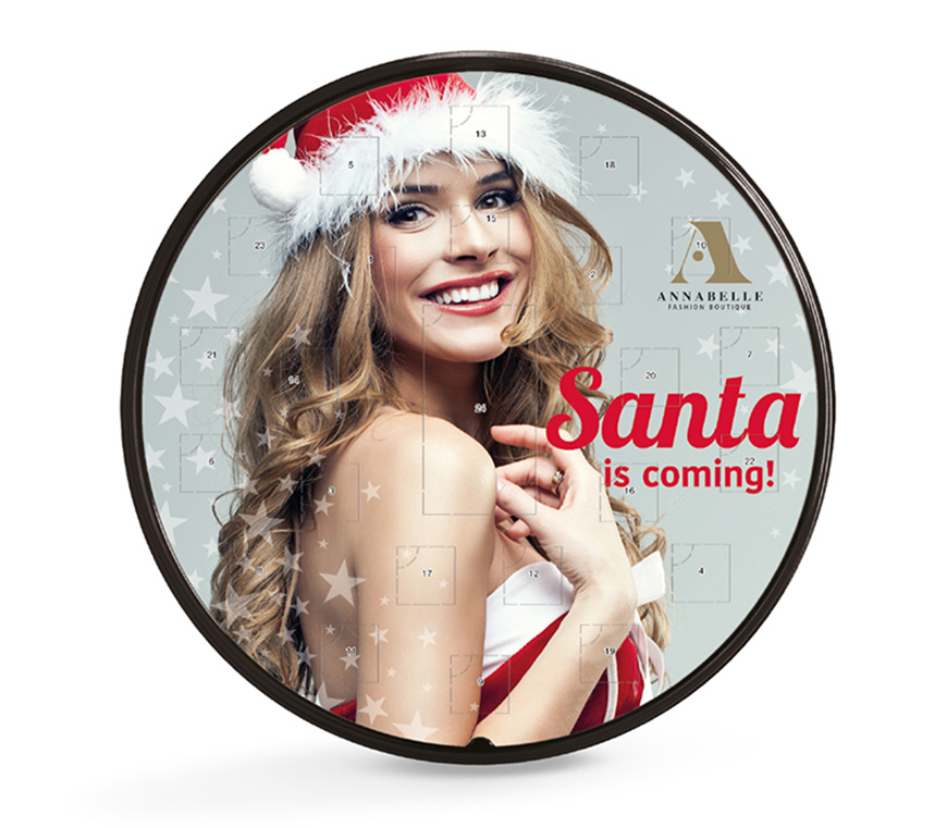Zeit, dass sich was dreht: Adventskalender mit edler Lindt Schokolade + 10 g Lindt Weihnachtsmann in Türchen 24, individuell bedruckt.