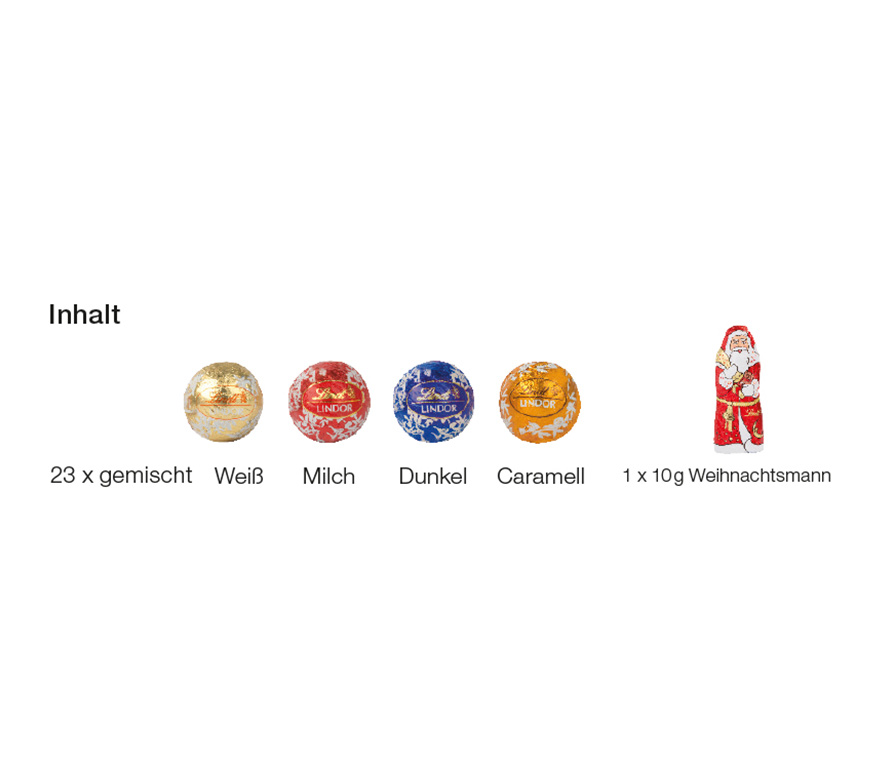 Inhalt: 23 Lindor Mini Kugeln der Marke Lindt Sprüngli, bunt gemischt. Hinter dem 24. Türchen verbirgt sich ein 10 g Lindt Weihnachtsmann, 113 g