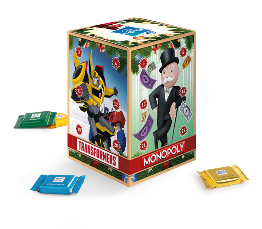 Tower-Adventskalender mit 5 Werbeflächen gefüllt mit 24 Ritter SPORT Quadretties. Individuell bedruckt - ein auffälliges Weihnachtsgeschenk.