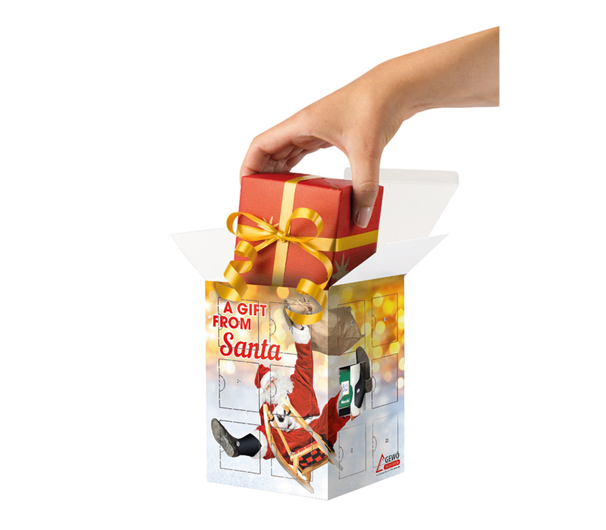 Produktbeschreibung: Adventskalenderturm, rundum individuell bedruckbar mit 5 Werbeflächen, Freier Innenraum: ca. 15,0 x 8,5 x 8,5 cm