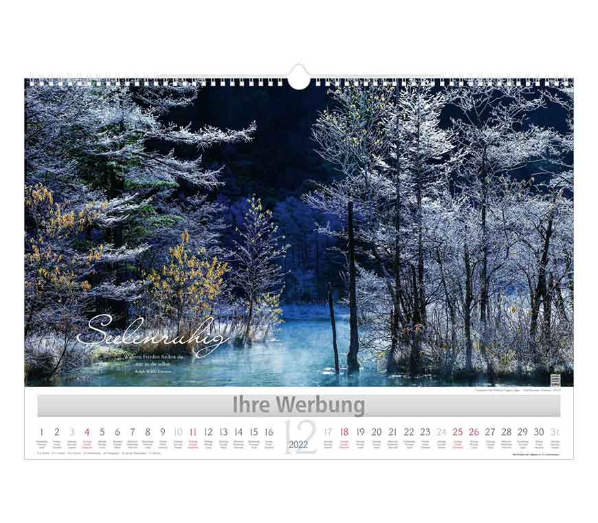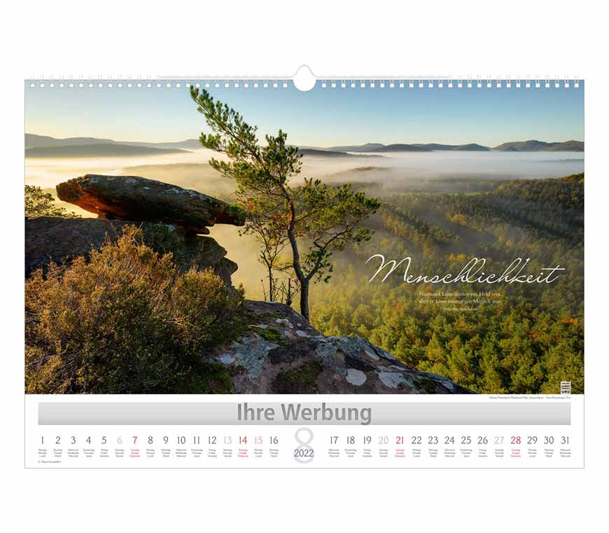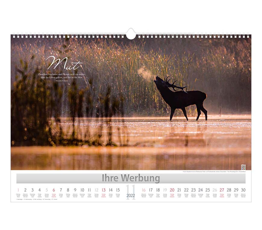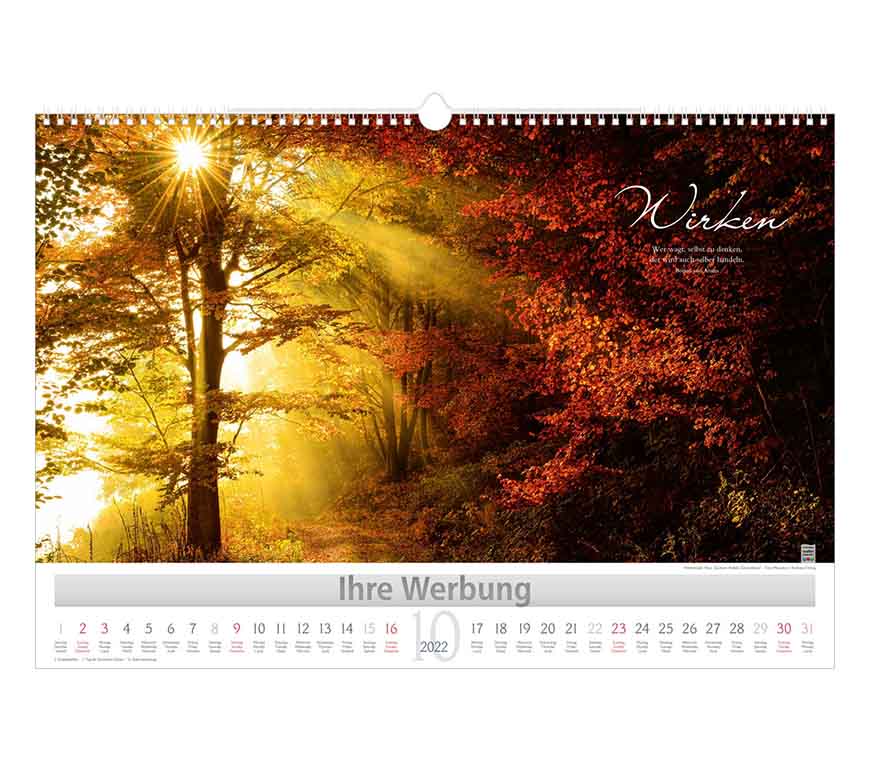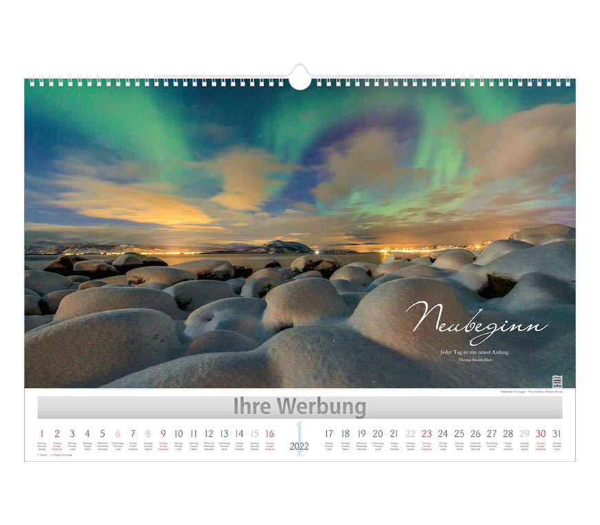 Auf unseren Bildkalendern können Sie Ihr Logo und ganze Werbebotschaften unterbringen. Natürlich ist es auch möglich, Ihre kompletten Kontaktdaten aufzudrucken. Ein Blick an die Wand und es erreicht Sie ein Anruf.