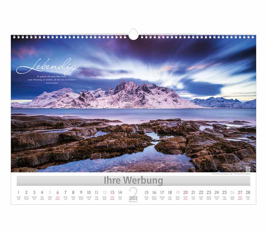 Suchen Sie Ihren Wandkalender unter den über 50 Motiven der Schuler Werbemittel GmbH aus, wir fügen Ihr Logo und Ihre Werbebotschaft ein. Unseren Kalender BOTANICA für die Wand erhalten Sie bereits ab 1,67€ pro Stück. Selbstverständlich variiert die Größe Ihrer Werbefläche mit der Größe des Kalenders. Ab 3,11€ pro Stück können Sie Ihren Kunden beispielsweise einen Bildkalender in 49x34 cm z.B. unseren Motivkalender WUNDERWERKE DER NATUR überreichen.