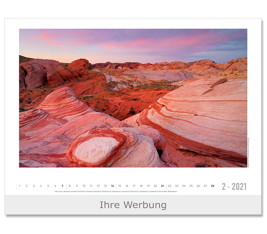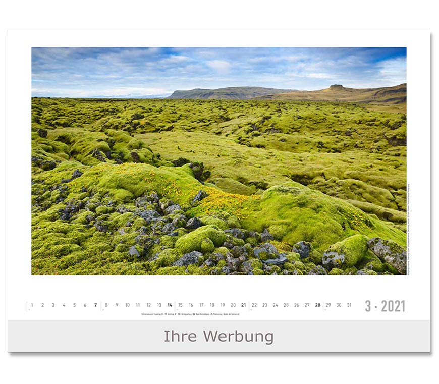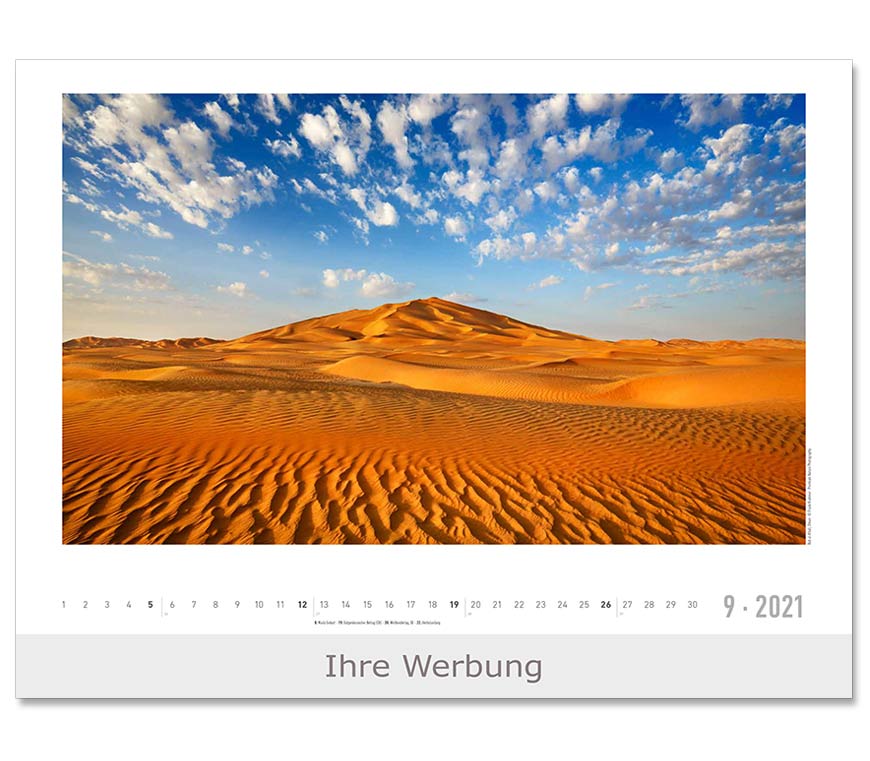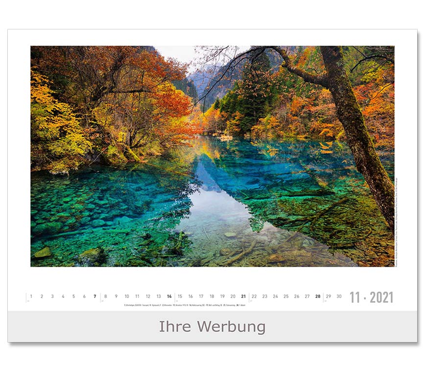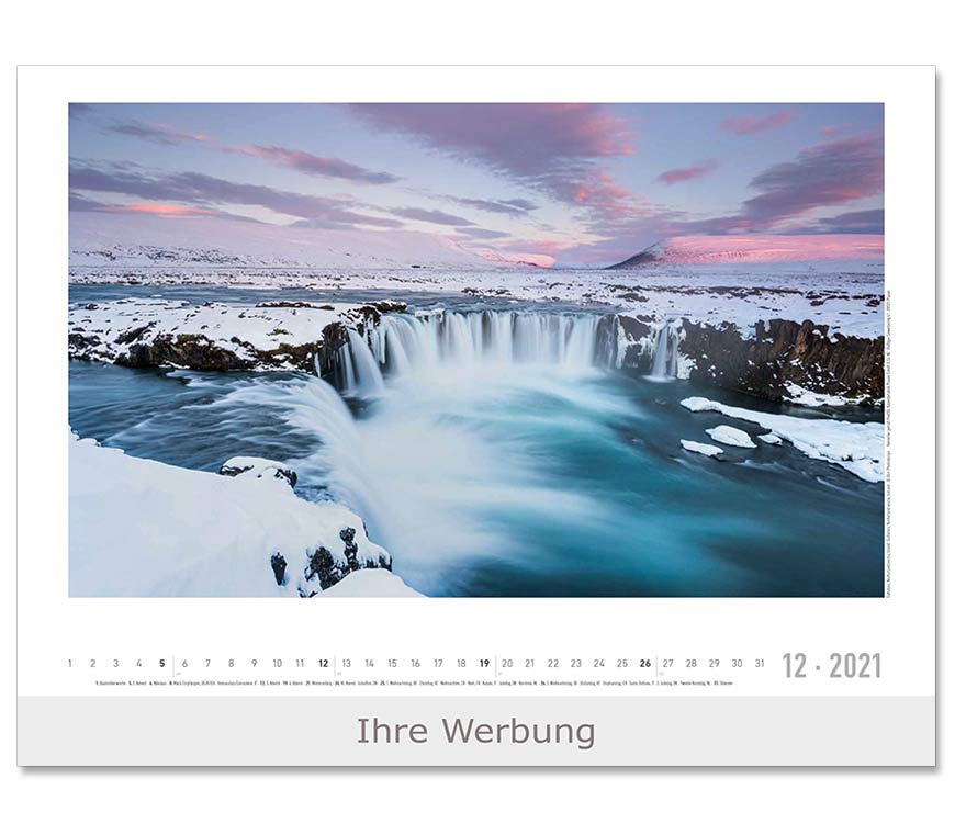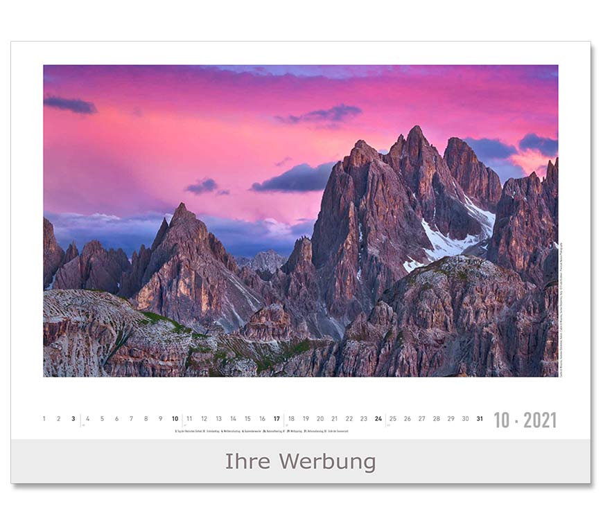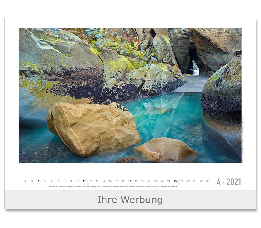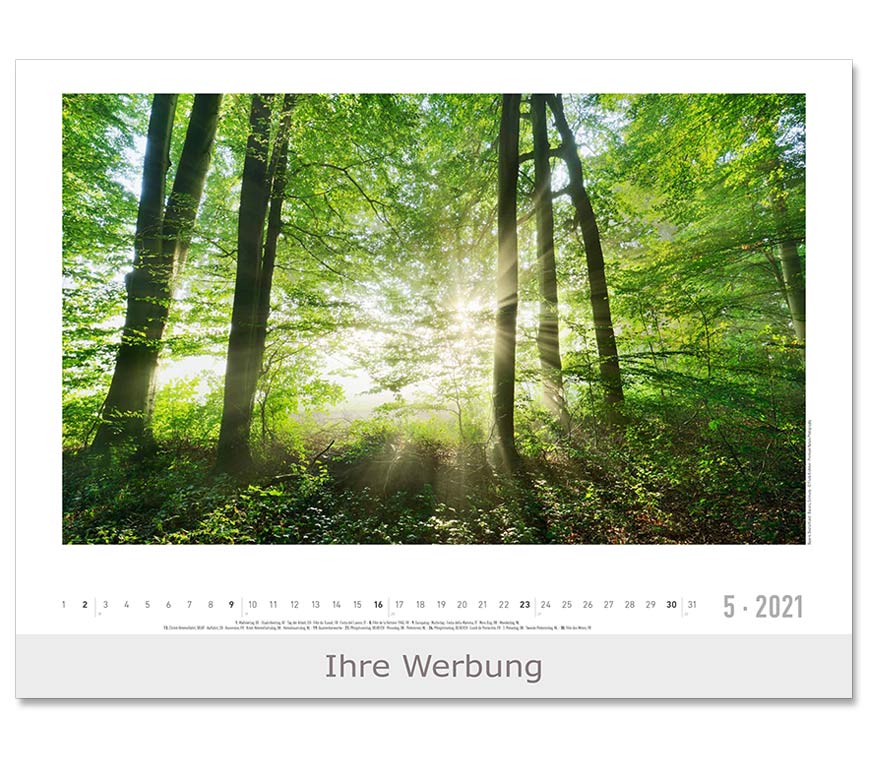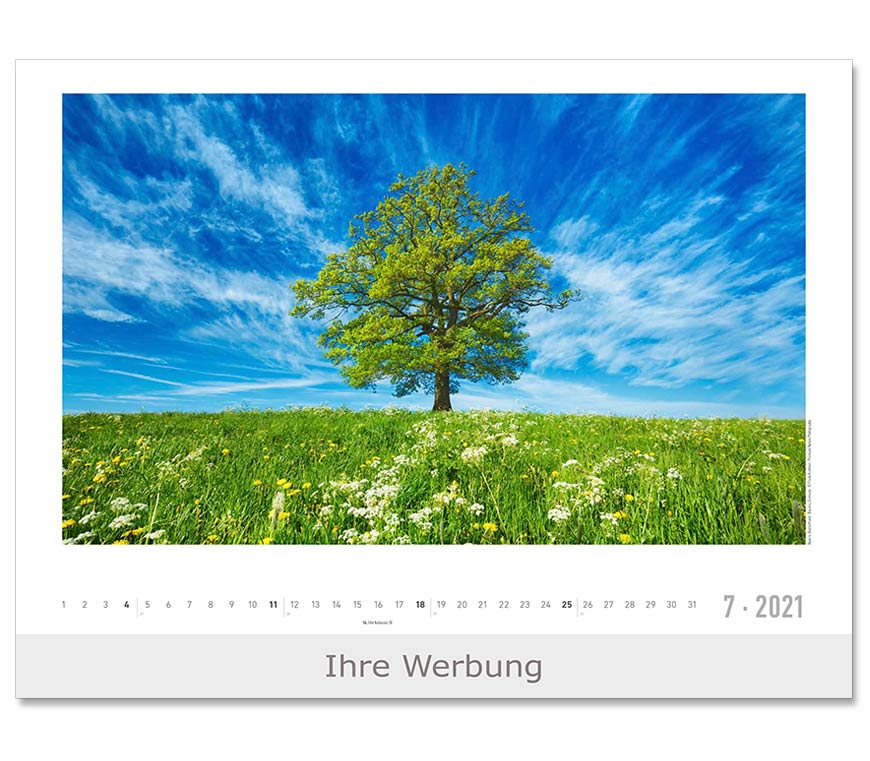 Auf unseren Bildkalendern können Sie Ihr Logo und ganze Werbebotschaften unterbringen. Natürlich ist es auch möglich, Ihre kompletten Kontaktdaten aufzudrucken. Ein Blick an die Wand und es erreicht Sie ein Anruf.