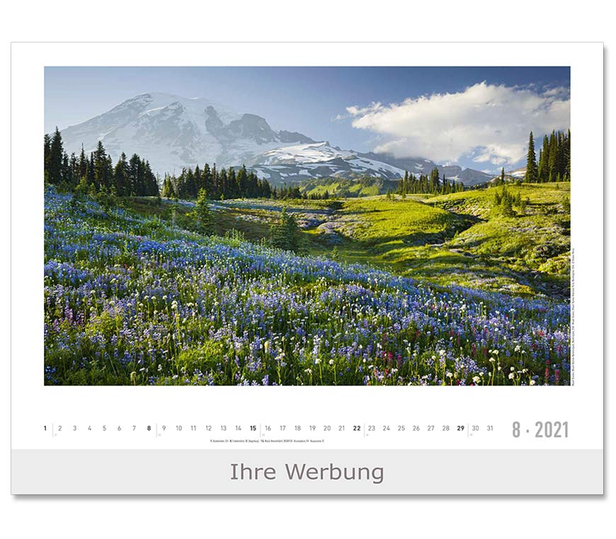 Suchen Sie Ihren Wandkalender unter den über 50 Motiven der Schuler Werbemittel GmbH aus, wir fügen Ihr Logo und Ihre Werbebotschaft ein. Unseren Kalender BOTANICA für die Wand erhalten Sie bereits ab 1,67€ pro Stück. Selbstverständlich variiert die Größe Ihrer Werbefläche mit der Größe des Kalenders. Ab 3,11€ pro Stück können Sie Ihren Kunden beispielsweise einen Bildkalender in 49x34 cm z.B. unseren Motivkalender WUNDERWERKE DER NATUR überreichen.