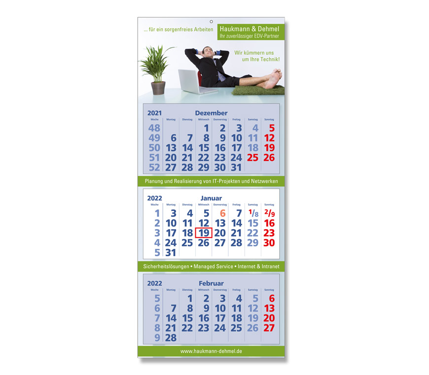 - Kalendarium in hellgrau oder hellblau, Sonn- und Feiertage jeweils in rot