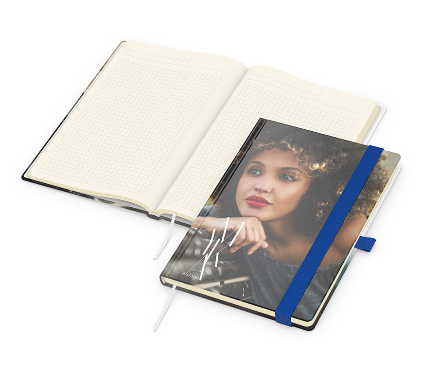 - Ausstattung: Hardcover, Buchblock und Decke mit runden Ecken, Lesezeichen, Kapitalband, runder Rücken, Notizseiten mit Winkelkaro, Mikroperforation, Einstecktasche, Gummiband und Stiftschlaufe in Standardfarbe (gelb, grün, orange, blau, rot, schwarz oder grau)