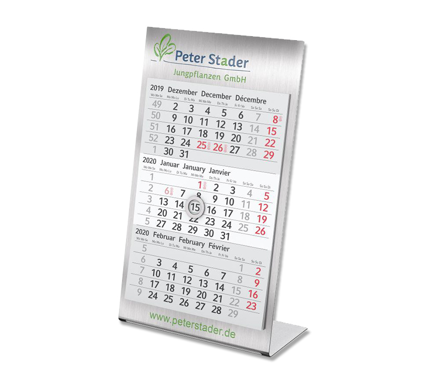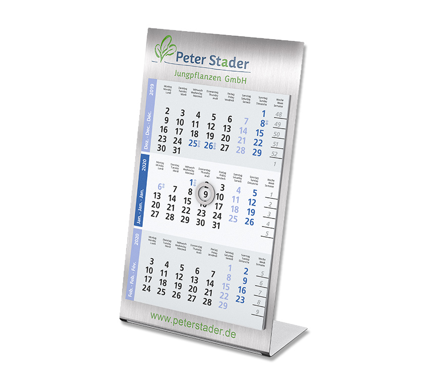 - Kalenderblocks mit Kopfleimung magnetisch haftend auf dem Edelstahl-Aufsteller