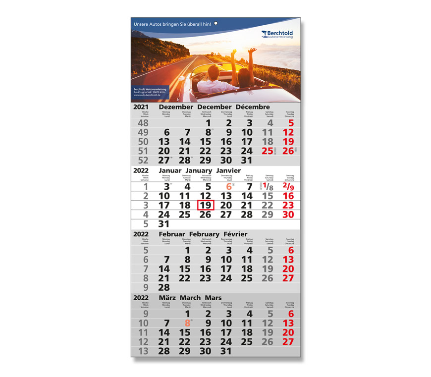 - Kalendarium in hellgrau oder hellblau, Sonn- und Feiertage jeweils in rot